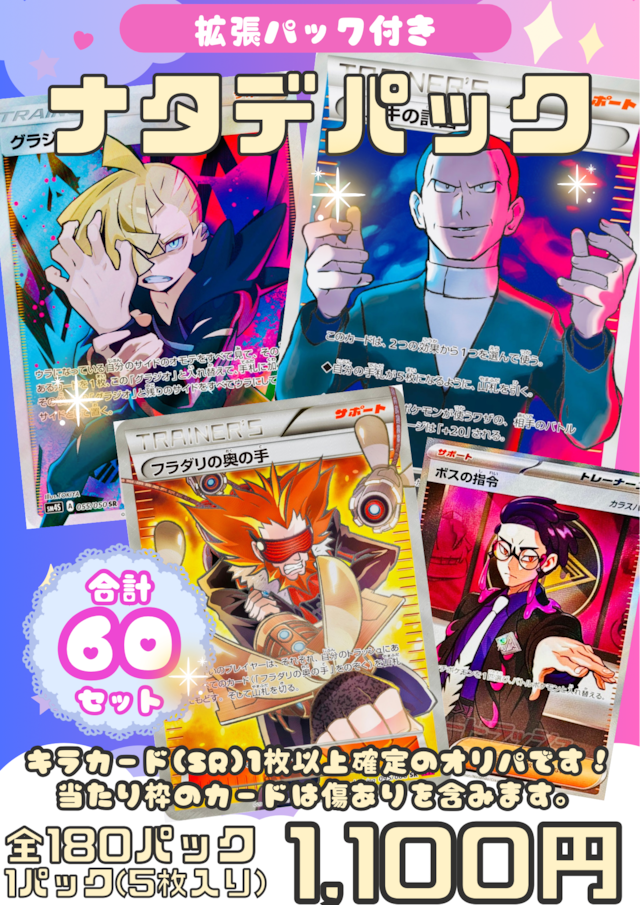 〜ナタデココオリパ 2026 vol.17〜 ◆ナタデパック グリーンver.◆ ポケモンカード 1パック1,100円(税込)オリパ ・3パックを1セットとして販売(1,100円×3口=3,300円) ・1パック5枚入り 全180パック 合計60セット ・送料は一律250円(ゆうパケット) ・1回の購入制限お一人様1セットまで(もちろん追加購入も大歓迎です⭕️) 今回のオリパはSR(HR/UR/SSR/SAR/P等含む)確定のオリパです❣️ さらに公式さんの拡張パックも1セットにつき1パックプレゼント❣️ ぜひ比較して開封お楽しみいただけたら幸いです(* .ˬ.) 通常販売時の演出オリパに比べて状態の許容範囲も広めですので 当たり枠も含め一律プレイ用のアウトレットオリパとお考えくださいませ。 拡張パックはスカーレット&バイオレット以降のものが中心ですが、一部ソード&シールドのパックもございます。ハイクラスパックも少数ご用意がございますが、基本的にはおまけですので過度な期待はしないでくださいね(⋆ᴗ͈ˬᴗ͈)” ☆大当たり☆ ・サカキの計画【SR】{064/059} ・フラダリの奥の手【SR】{095/088} ・グラジオ【SR】{055/050} ・ボスの指令/カラスバ(SR仕様)【-】{760/742} ⭐️ご注意⭐️ <カードの内容について> 私のオリパは現行レギュレーションのカードはもちろん、それ以前のSM(GX)、XY(EX)、BW、DP、カードe、旧裏などコレクターの方向けのカードも封入しています«٩(*´ ꒳ `*)۶» カードのお値段についてはネットショップさんの販売価格を参考にしております...φ( ˙꒳˙ )ホォホォ シャッフルして購入口数分選択するため、内容に偏りがある場合もございます( ´•ᴗ•ก) <カードの状態について> 状態許容範囲・・・A、A-、B、C ❤️グレーディングについて❤️ 状態A・・・美品 状態A-・・・やや傷や汚れあり 状態B・・・傷や汚れあり 状態C・・・目立つ傷や汚れあり ※詳細はこちら\_( '-' ) https://natadecoco.pokemon-card.shop/p/00001 ナタデパックは通常販売時の演出オリパに比べて状態の許容範囲が広めです。 当たり枠も含め、一律プレイ用のアウトレットオリパとお考えくださいませ。 そのため、カードの状態での返品等の対応は出来かねてしまいます。 なにとぞご了承のほど、よろしくお願いいたします。 今後の商品作りに活かしていきたいと思っておりますので、レビューにて傷の状態について皆さんのご意見お聞かせいただけたら嬉しいです! <発送・支払方法について> 基本的にご注文後、3~4日以内に発送させていただきます❣️ 発送後の事故は保証できません( ´•̥ω•̥`) コンビニ払いにも対応できるようになりました((⊂(。`・ω・´。)⊃))バーン おまとめ発送には対応することができません('ω'乂) <最後に> 日頃みなさんから買取させて頂いたカードも入っています❣️ 貴重なカードをいつも本当にありがとうございます☺️ レビュー・開封ポストご協力ありがとうございます❣️ 開封ポストの際は#ナタコレを付けていただけたら嬉しいです(o・ω-人) ご不明点ございましたらお気軽にお問い合わせください。 お問合せはコチラから\_( '-' ) < E-mail > ショップ情報 ⏩ ショップへのお問い合わせ ⏩ Eメール送信 < Twitter > @natadecoco_shop ⏩ DM送信 ⭐️古物商許可情報⭐️ 千葉県公安委員会 許可証の番号:第441120001326号