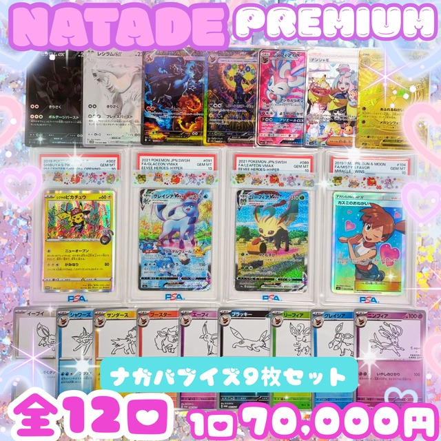 高額オリパは基本的に当たり枠及びその他枠をサムネだけではなく、実在庫の画像で公開するように努めております。ネットでオリパを販売する上でそれは必要最低限のマナーだと弊社では考えております❣️ 〜ナタデココオリパ 2026 vol.10〜 ◆ナタデプレミアム◆ ポケモンカード 1口70,000円(税込)演出オリパ ・1口1~2枚入り全12口ラインナップ全公開\\\\✧(۶•̀ᴗ•́)۶✧//// ・送料は250円(ゆうパケット) or 520円(レターパックプラス) ・1回の購入口数制限お一人様2口まで(追加購入も大歓迎です⭕️) ❤️演出一覧❤️ ????・・・・・中当たり以上の当たり確率100% アミュレッタ・・・小当たり以上の当たり確率50% マグ・・・・・・・小当たり以上の当たり確率30% バチラ・・・・・・小当たり以上の当たり確率20% ミルフィーヌ・・・小当たり以上の当たり確率10% ☆大当たり☆ ・〔PSA10鑑定済〕グレイシアVMAX(SA)【HR】{091/069} ・〔PSA10鑑定済〕リーフィアVMAX(SA)【HR】{089/069} ・YU NAGABAブイズ9枚セット ◎中当たり◎ ・〔PSA10鑑定済〕カスミのおねがい【SR】{104/094} ・〔PSA10鑑定済〕シブヤのピカチュウ【P】{002/S-P} ◯小当たり◯ ・メガリザードンXex【SAR】{110/080} △その他△ 画像にてラインナップ全公開しております((⊂(。`・ω・´。)⊃))バーン ⭐️ご注意⭐️ <カードの内容について> 商品ページに当たり枠、その他枠含めラインナップを全公開しております! ご購入前によくご確認の上、ご検討お願いいたします(。•̀ᴗ-)✧ カードのお値段についてはネットショップさんやフリマサイトさんの販売価格を参考にしております...φ( ˙꒳˙ )ホォホォ シャッフルして購入口数分選択するため、内容に偏りがある場合もございます( ´•ᴗ•ก) <カードの状態について> 状態許容範囲・・・S、A、A- ❤️グレーディングについて❤️ 状態S・・・新品・未開封品 状態A・・・美品(商品ページに許容範囲の参考画像を載せております⚆.⚆) 状態A-・・・ややキズや汚れあり ※詳細はこちら\_( '-' ) https://natadecoco.pokemon-card.shop/p/00001 商品は全て中古品です。多少のキズは容認しております(´。・д人) キズの判断は個人差もありますので、完美品をお求めの方はご購入をお控えいただけたら幸いです(^ ̥_ ̫ _ ̥^) 届いたカードの状態で何か気になる点がございましたらご一報くださいませ(❁ᴗ͈ˬᴗ͈)ペコリ。:.゚ஐ⋆* <発送・支払方法について> 基本的にご注文後、3~4日以内に発送させていただきます❣️ 発送後の事故は保証できません( ´•̥ω•̥`) コンビニ払いにも対応できるようになりました((⊂(。`・ω・´。)⊃))バーン 同じ商品を複数回に分けてご購入いただいた場合、ゆうパケットは個別のおまとめ発送には対応することができません('ω'乂)レターパックの場合はまとめて発送させていただきますd(ゝω・´○) <最後に> 日頃みなさんから買取させて頂いたカードも入っています❣️ いつも綺麗なカードをありがとうございます☺️ レビュー・開封ポストのご協力ありがとうございます❣️ 開封ポストの際は#ナタコレを付けていただけたら嬉しいです(o・ω-人) 特賞が当たった方でBASEのレビュー or Xの開封ポストにご協力いただけた方には、次回ご購入いただいた際にメッセージカードを添えさせていただきます|ω・`)つ そっ…□ ご不明点ございましたらお気軽にお問い合わせください。 お問合せはコチラから\_( '-' ) < E-mail > ショップ情報 ⏩ ショップへのお問い合わせ ⏩ Eメール送信 < Twitter > @natadecoco_shop ⏩ DM送信 ⭐️古物商許可情報⭐️ 千葉県公安委員会 許可証の番号:第441120001326号